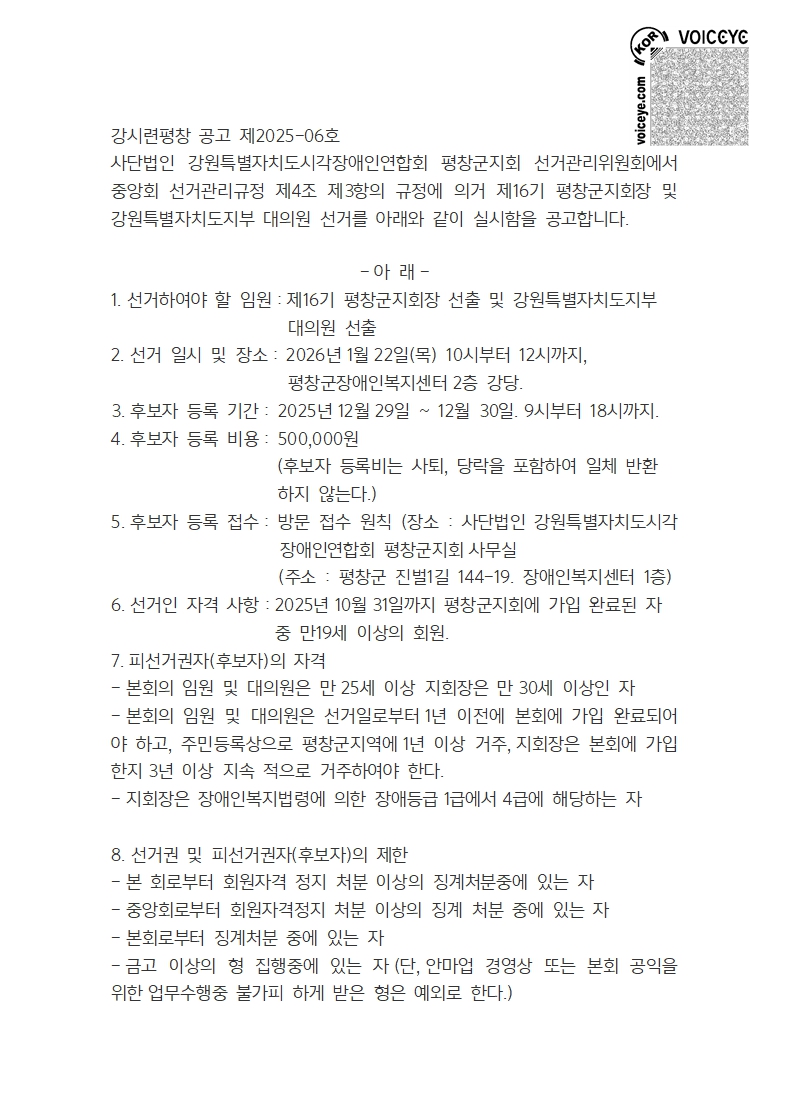 (사)강원특별자치도시각장애인연합회 평창군지회 제16기 평창군지회장 및 대의원선출 선거 선거인명부 게시